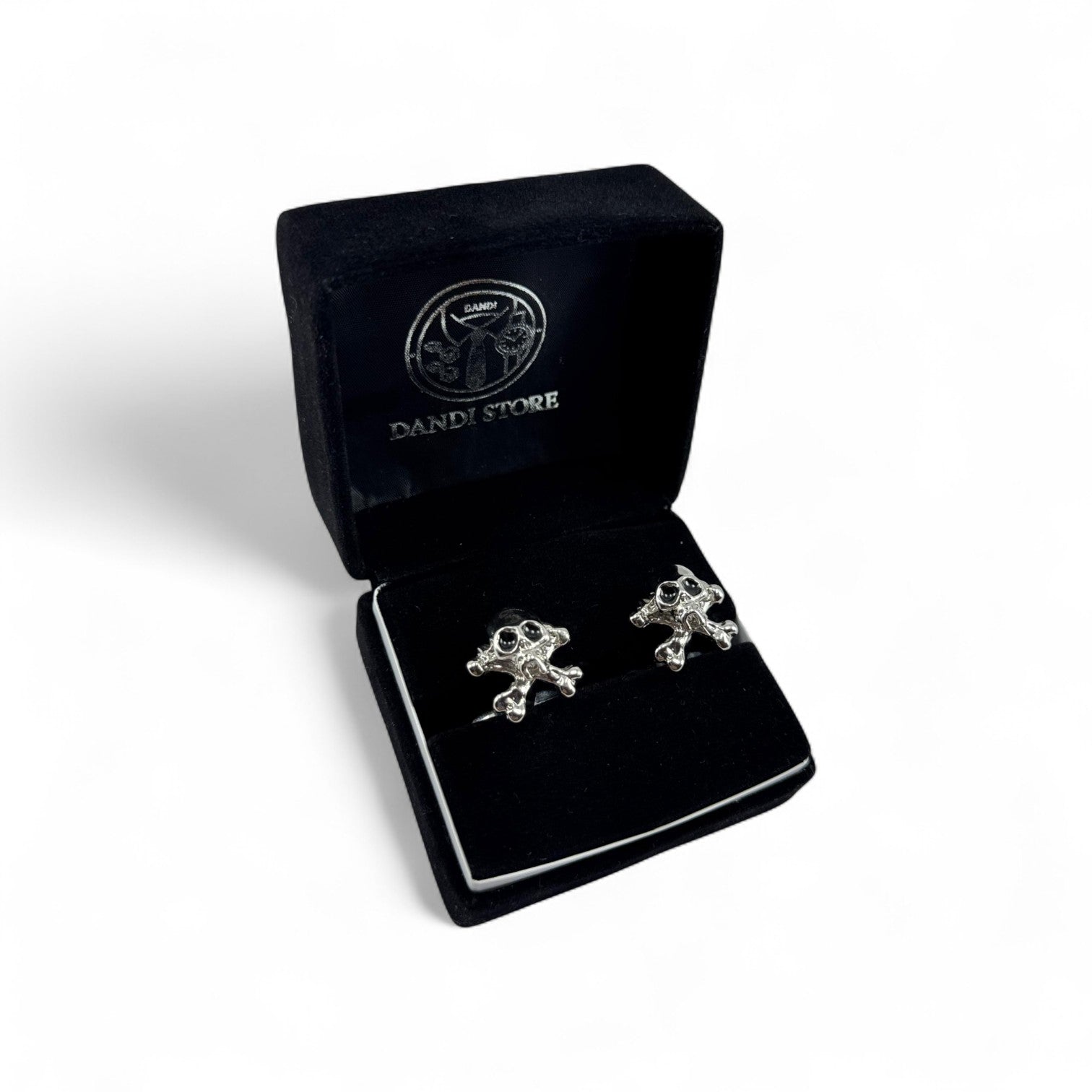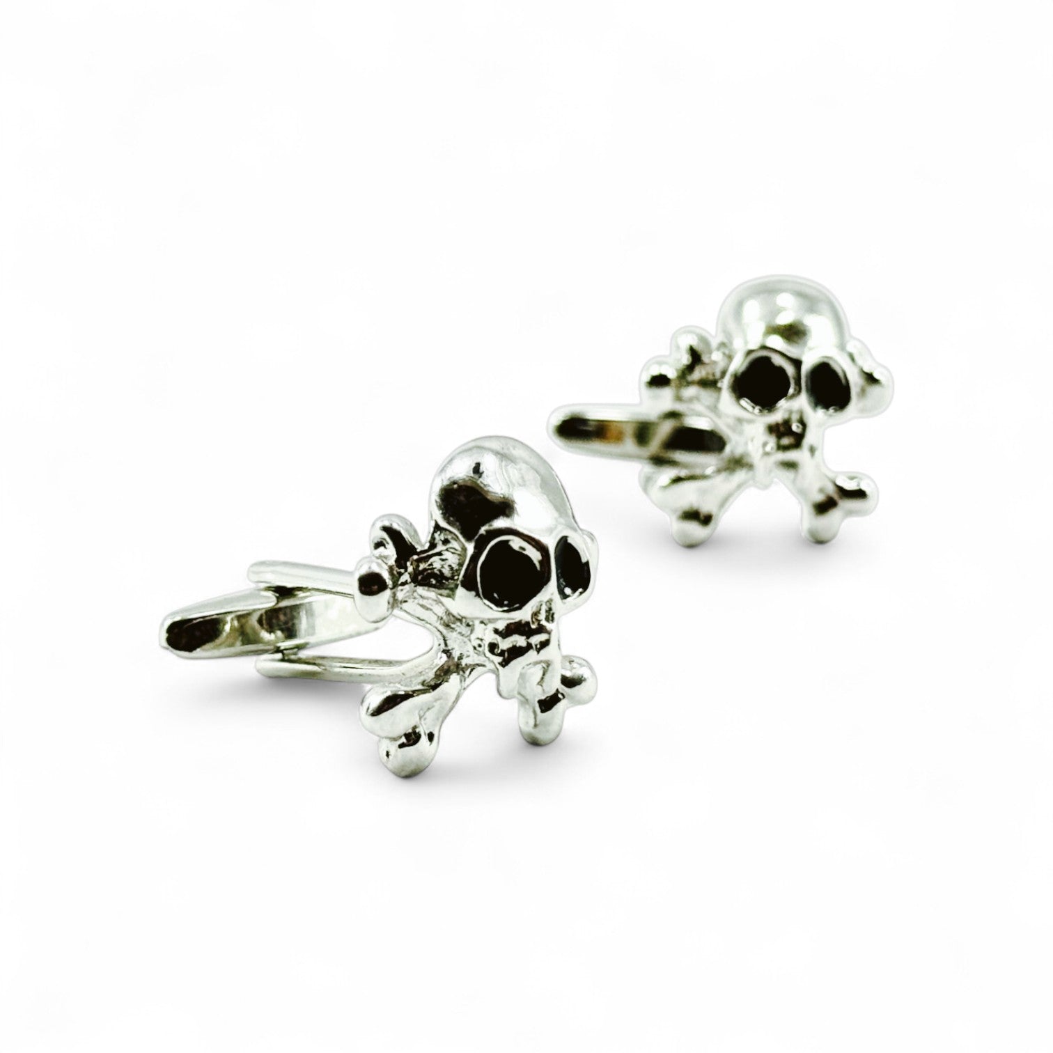 Un accesorio audaz que refleja personalidad y fuerza. Estas mancornas en forma de calavera con huesos cruzados destacan por su acabado metálico brillante y detalles en negro que resaltan la intensidad de su diseño.
