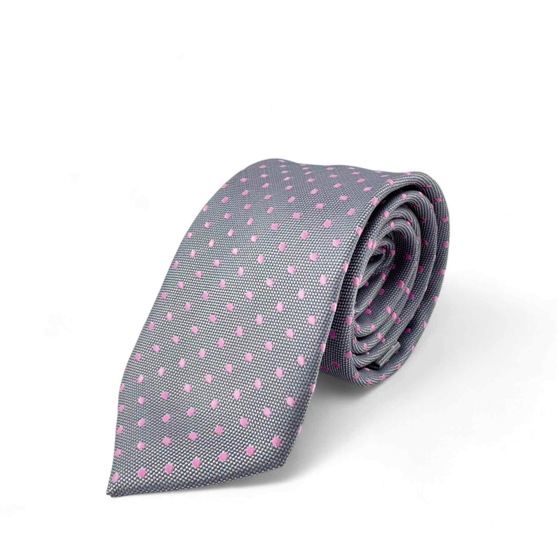 Un equilibrio entre sobriedad y frescura. Esta corbata en tono gris elegante se realza con un patrón de puntos rosados que aportan un detalle moderno y distintivo a tu atuendo. Ideal para hombres que buscan un accesorio con carácter y sofisticación.