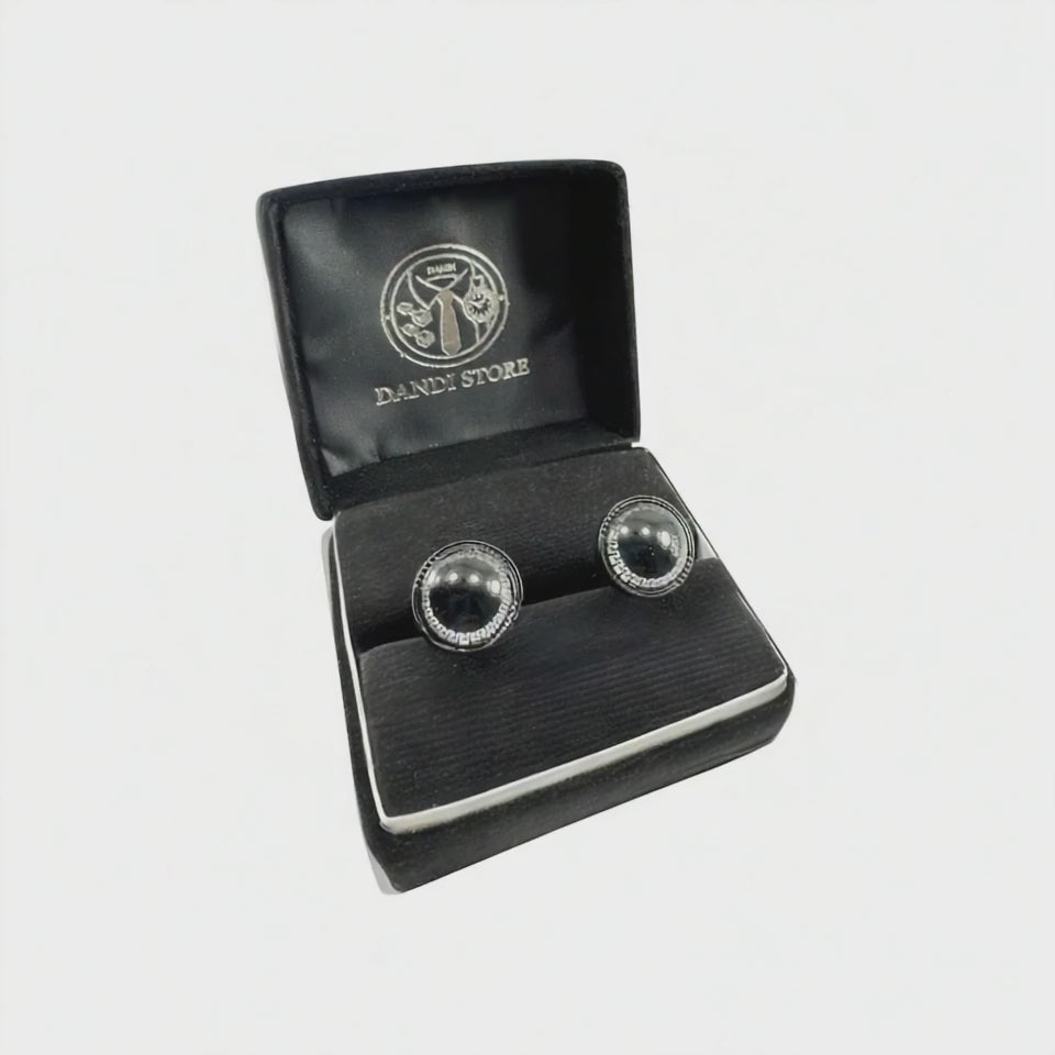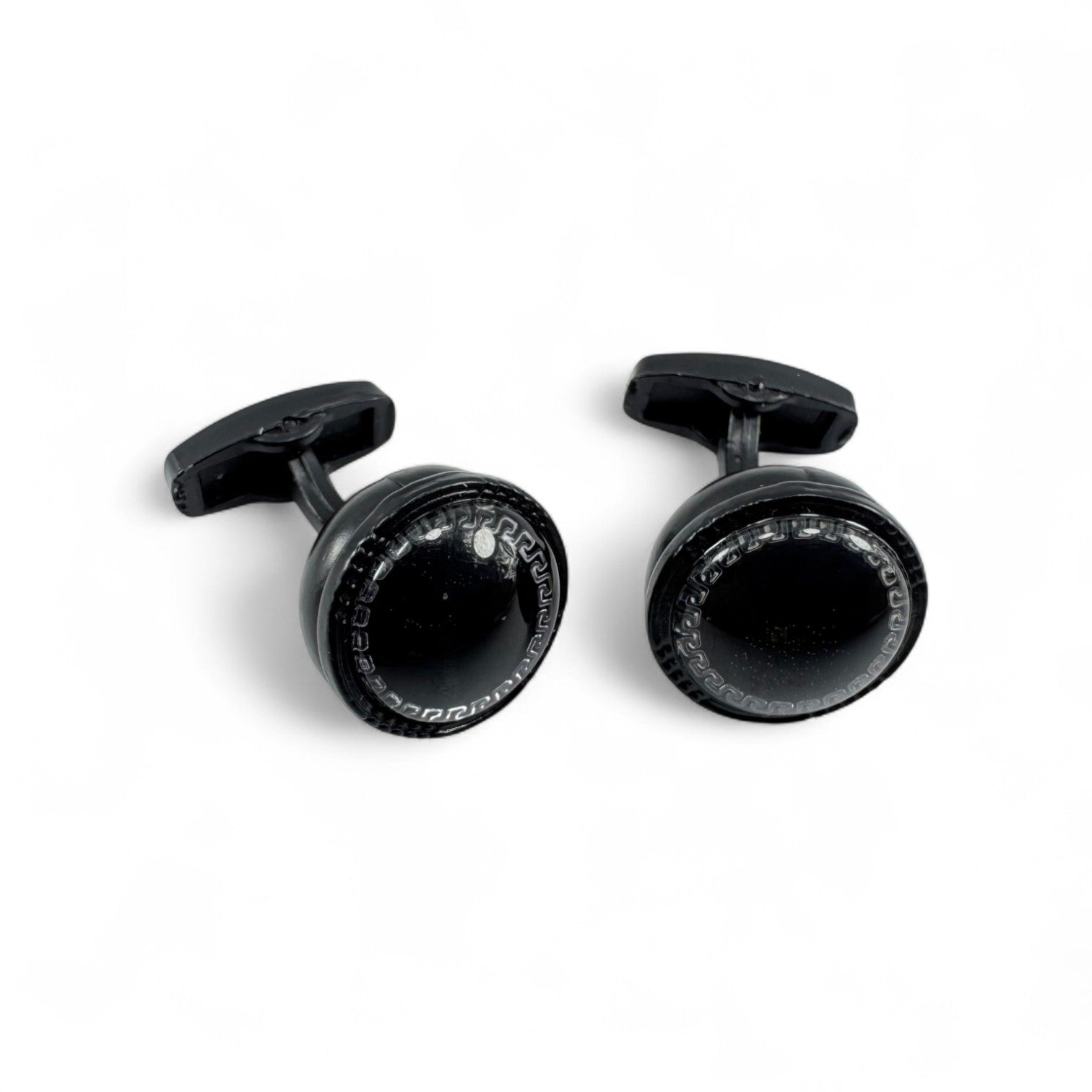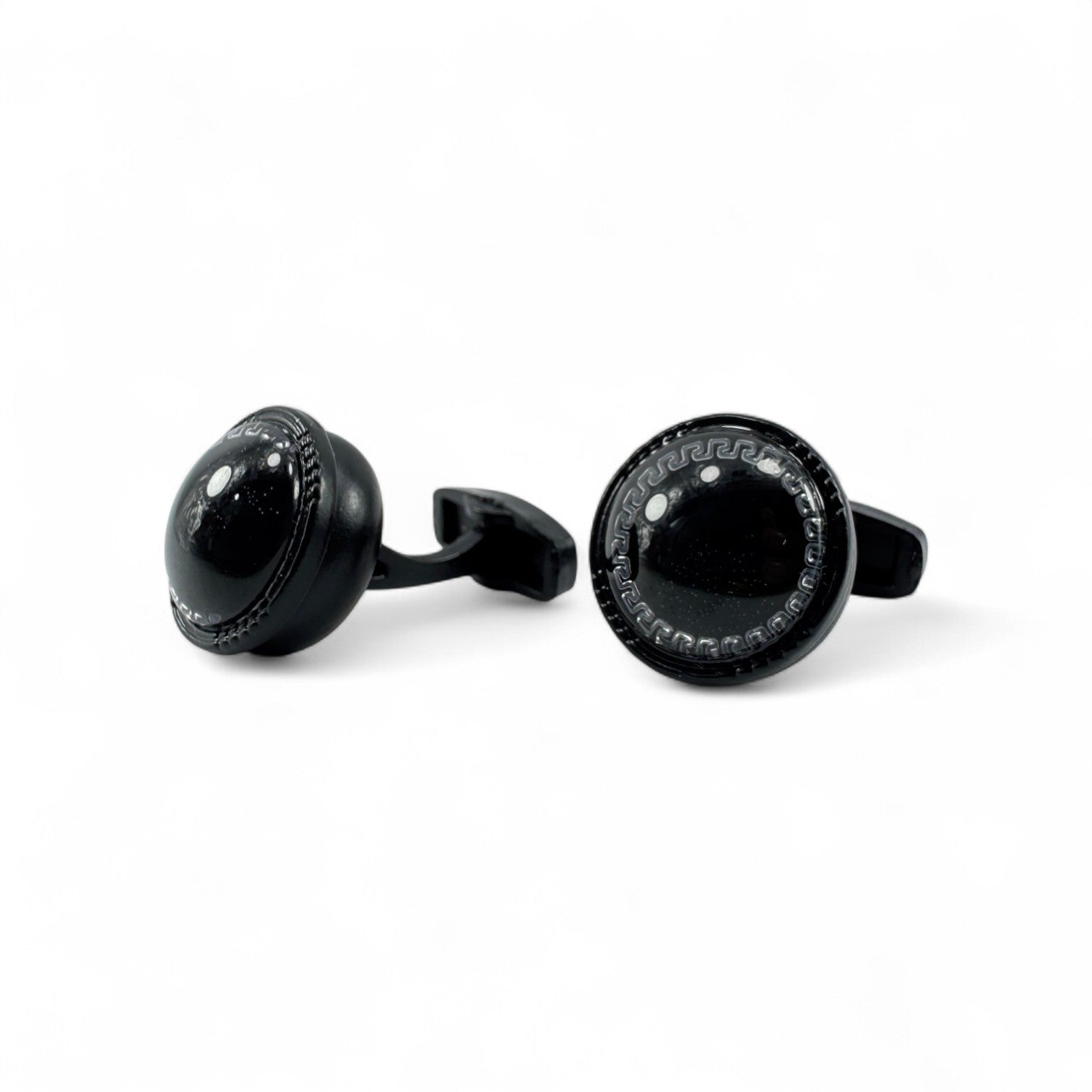 Un accesorio sobrio y sofisticado para el hombre que aprecia la elegancia en cada detalle. Estas mancornas en tono negro profundo destacan por su diseño redondeado y el delicado patrón en forma de greca que enmarca su contorno, aportando un aire clásico y refinado.