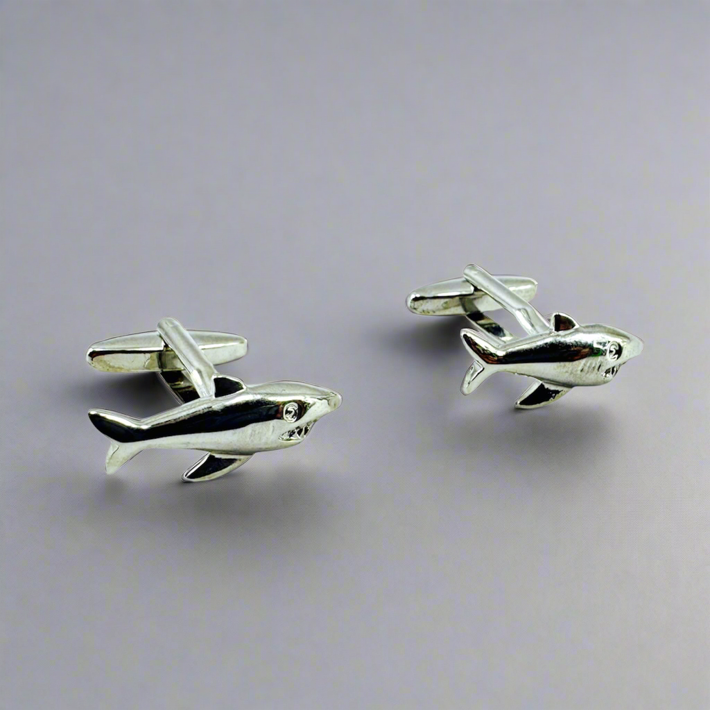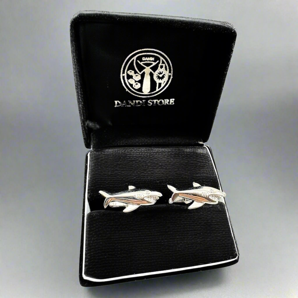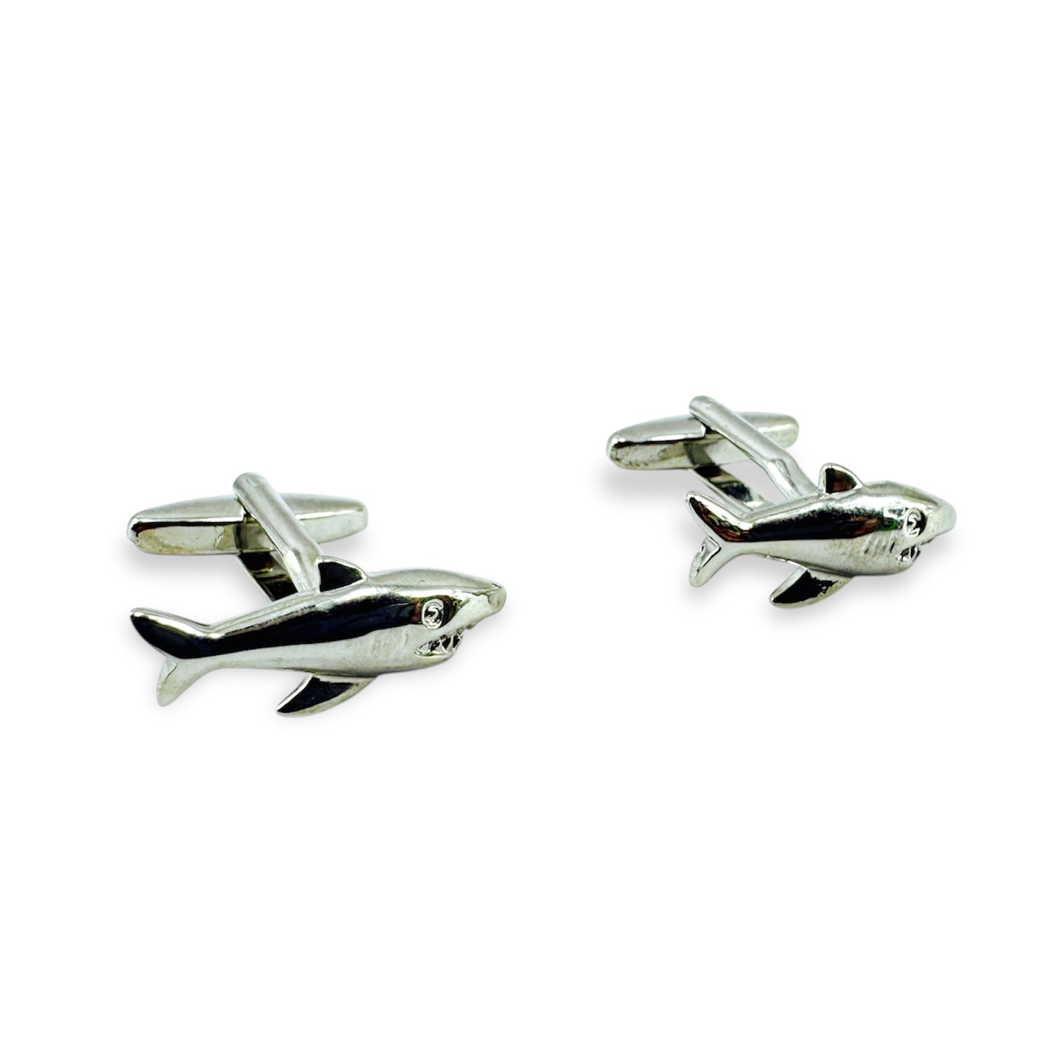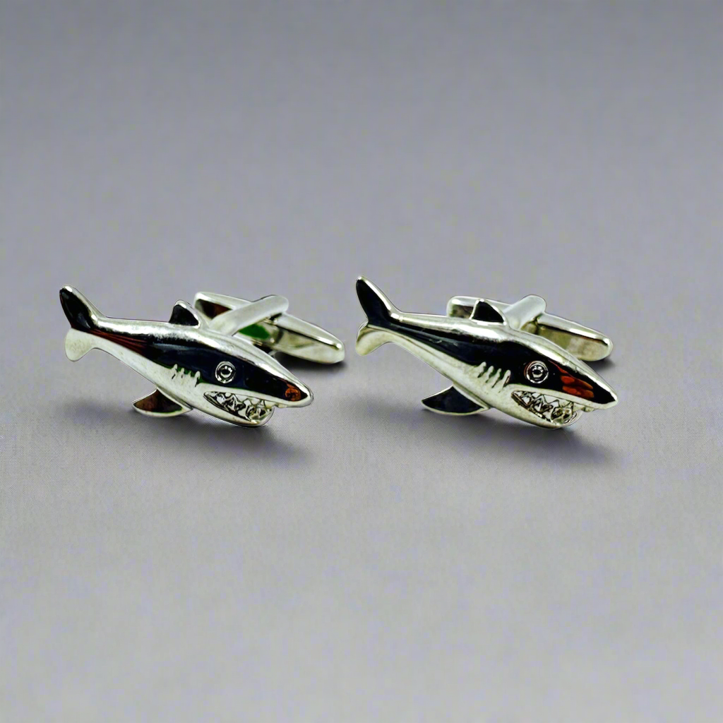 Un accesorio audaz para el hombre que no teme destacar. Estas mancornas en forma de tiburón, con detalles metálicos y esmalte negro, combinan un diseño elegante con un toque de carácter y originalidad. Perfectas para quienes buscan transmitir fuerza y confianza.