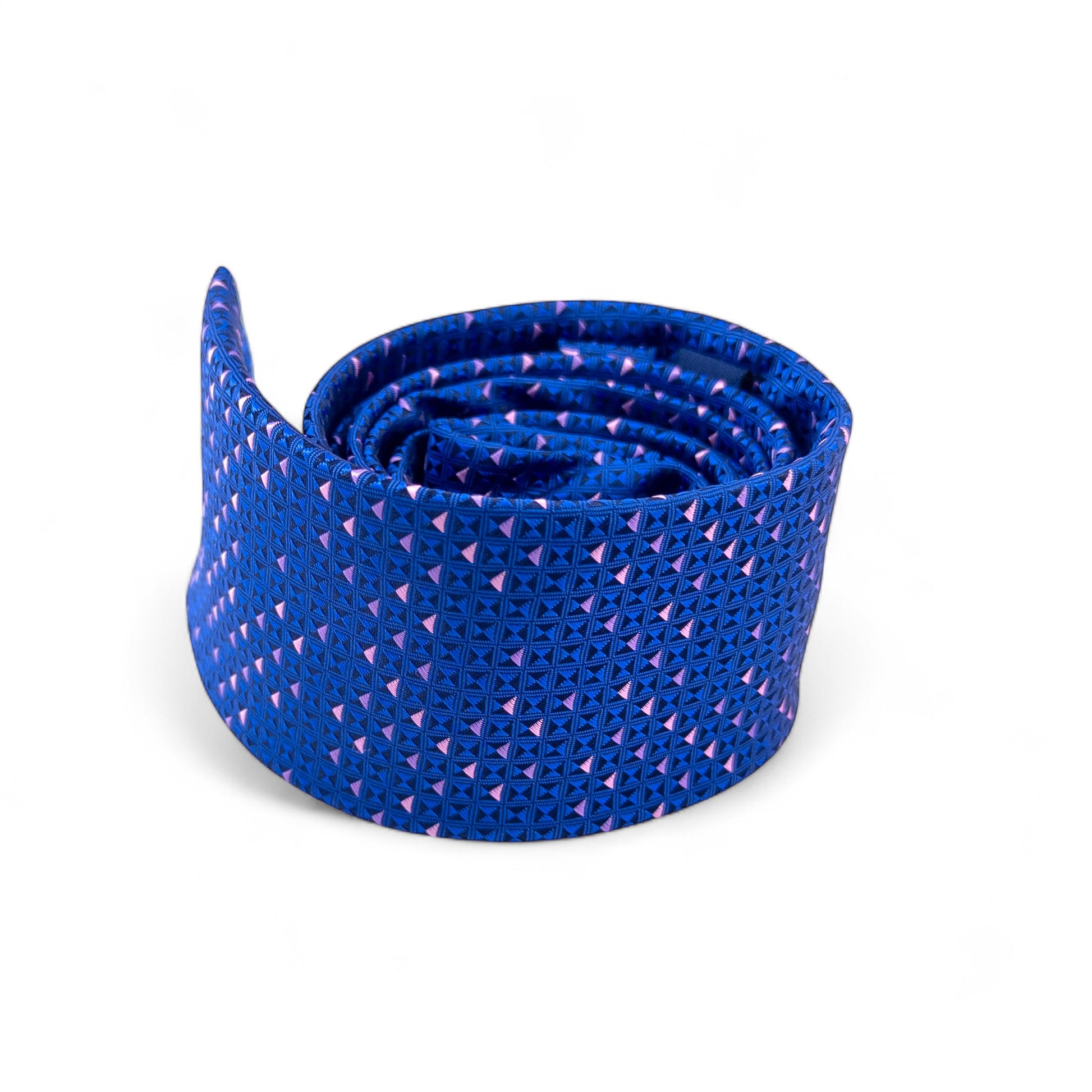 Un diseño atrevido y elegante que combina el azul intenso con un patrón geométrico en detalles rosados, creando un contraste único y sofisticado. Ideal para quienes buscan proyectar personalidad y estilo sin perder la esencia de la elegancia masculina.